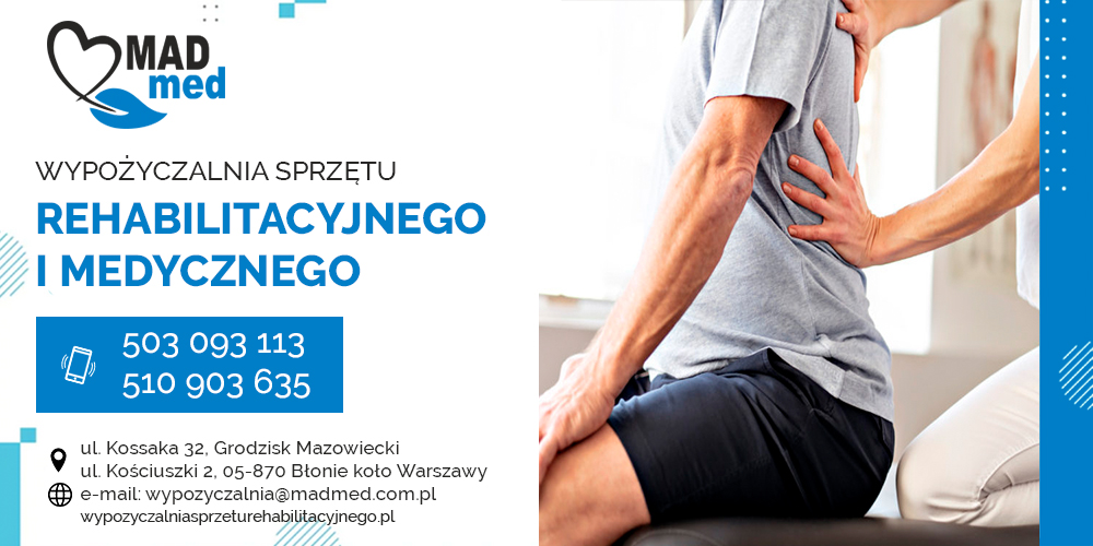 Nasza wypożyczalnia sprzętu medycznego daje możliwość dokonania zamówienia online, a następnie zapewnia otrzymanie wynajętych elementów wyposażenia w ramach dostawy organizowanej przez firmę lub kurierem (w zależności od rodzaju produktu - oferujemy osobistą dostawę, wniesienie oraz montaż w przypadku rehabilitacyjnych towarów wielkogabarytowych). Istnieje również możliwość odbioru osobistego w jednym z punktów MAD-MED w Błoniu, Grodzisku Mazowieckim lub Ożarowie Mazowieckim – zgodnie z twoimi preferencjami. Odwiedź nasz sklep internetowy i przekonaj się, że wypożyczamy wszystko, co niezbędne osobom starszym, schorowanym czy o obniżonej sprawności ruchowej, które potrzebują wsparcia w codziennej pionizacji i poruszaniu się. Warunki oferowanego przez nas wynajmu online na pewno odpowiedzą na twoje potrzeby, zapewniając oszczędności w ramach nabycia koniecznego sprzętu medycznego i rehabilitacyjnego.